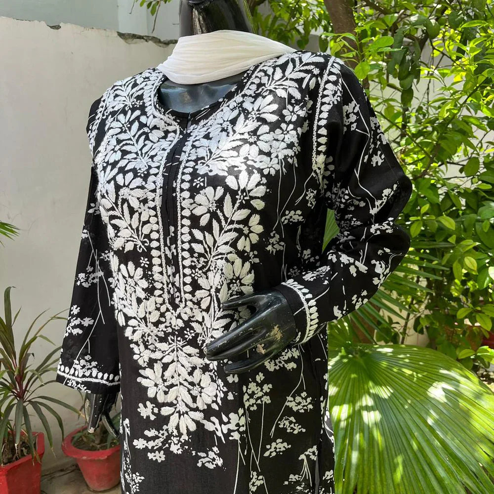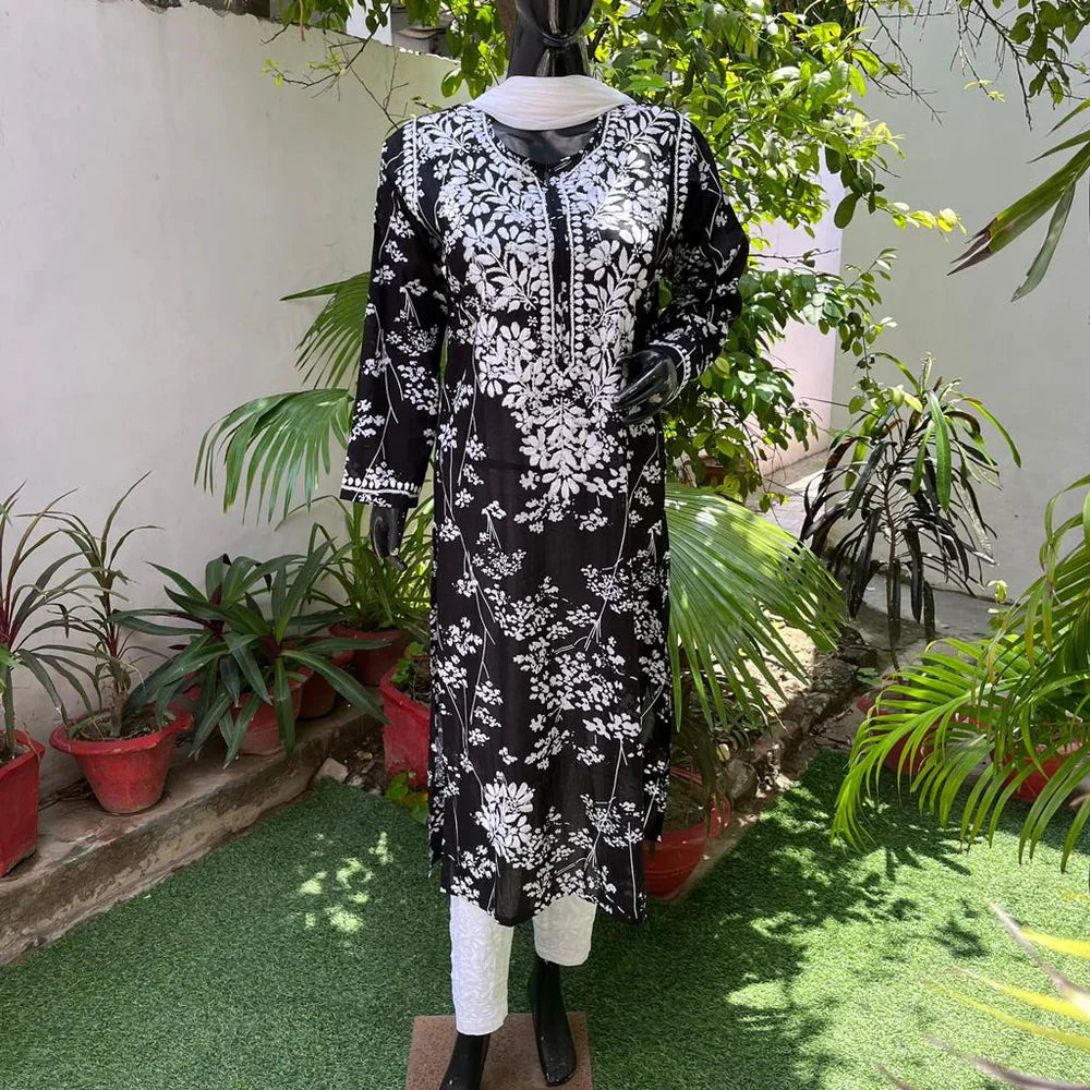 Black long Mulmul kurta with chikankari handwork in Paisley and Floral intricate pattern on soft, flowy & printed fabric.